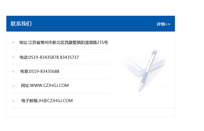 地址:常州市新北區友邦商務大廈1幢16、17層  電話:0519-85101652  傳真:0519-85112595  郵編:213022  網址:www.cz-jiayue_cn.fypsky.com  郵箱:xiajifengaa@163.com